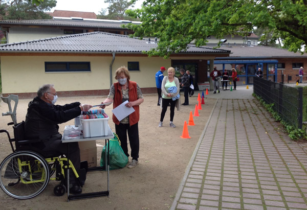 unsere Helfer vor das aqua Stadtbad und der Sporthalle (Grundschule Nord) in Hennigsdorf im Mai / Juni 2020